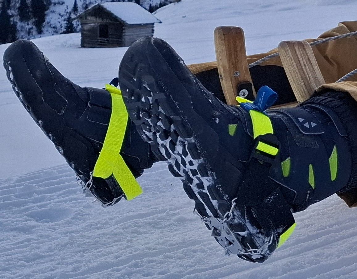 Scope of delivery: one pair of patented braking aids with spikes and fastening strap (350g), Velcro strap for transport protection, storage bag, instruction manual, (the shoes in the illustrations are not included).
